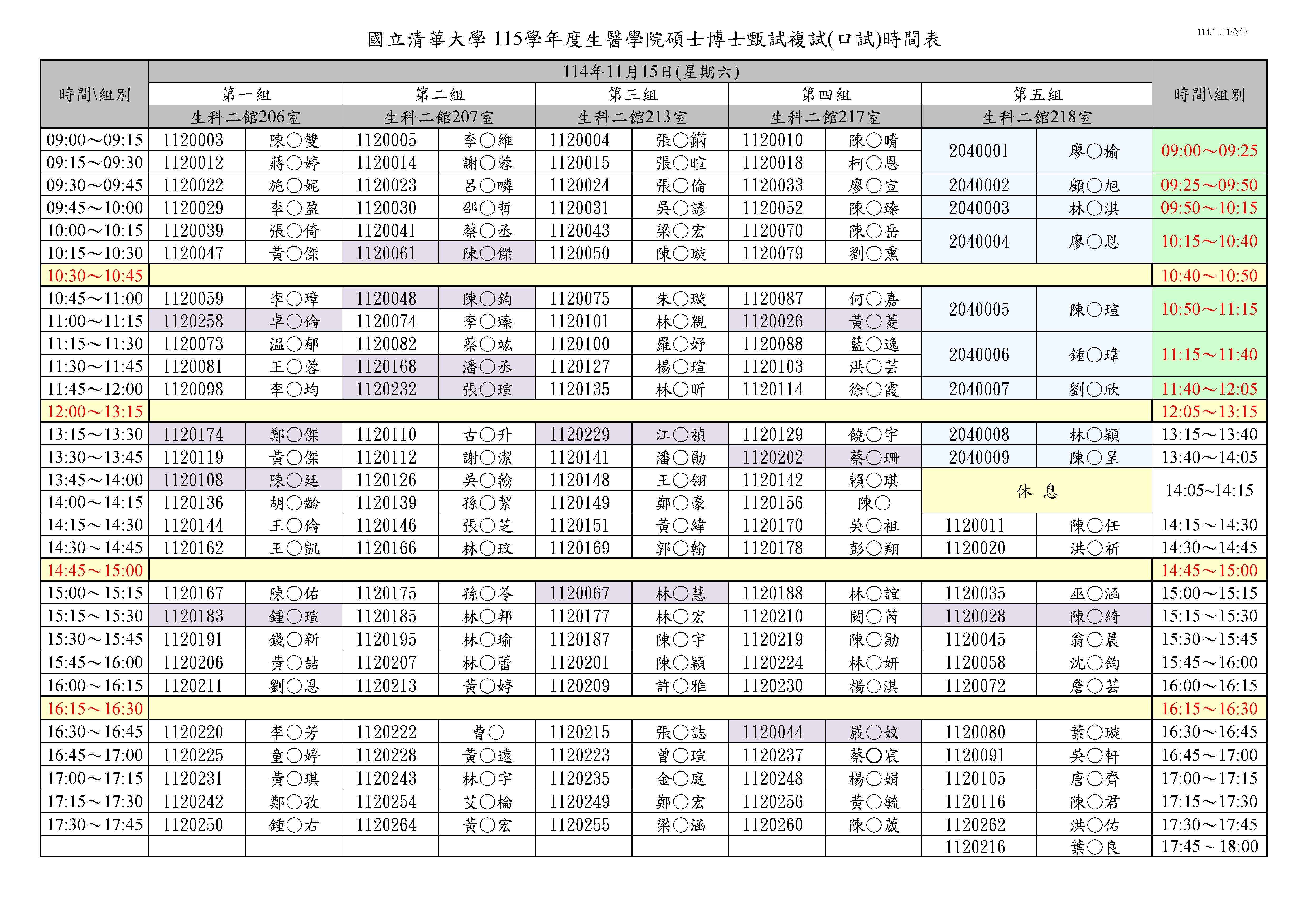 115學年度生醫學院碩博班甄試 口試時間表1151111_公告(隱藏版).pdf